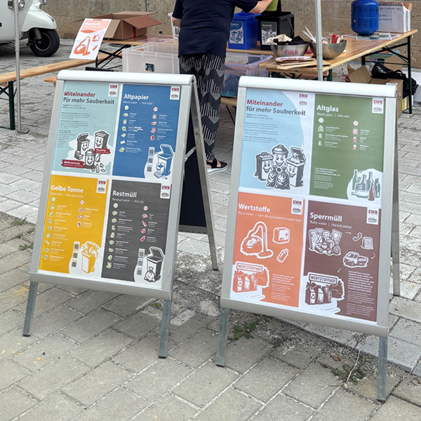 Auf einem Mieterfest der EWB kamen die von stolp+friends gestalteten Kommunikationsmittel zusätzlich zum Einsatz. Dort wurde mithilfe eines Quiz auf spielerische Weise korrekte Mülltrennung vermittelt. Informative Plakate klärten die Teilnehmenden zusätzlich darüber auf, was eigentlich mit ihrem Müll passiert, nachdem er in der Tonne landet – und warum die richtige Trennung deshalb so wichtig ist.