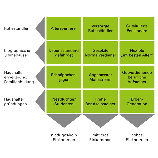 Lebensphase: von Haushaltsgründungen über Familienbildung und eine biografische „Ruhepause“ bis zu Ruheständler:innen.